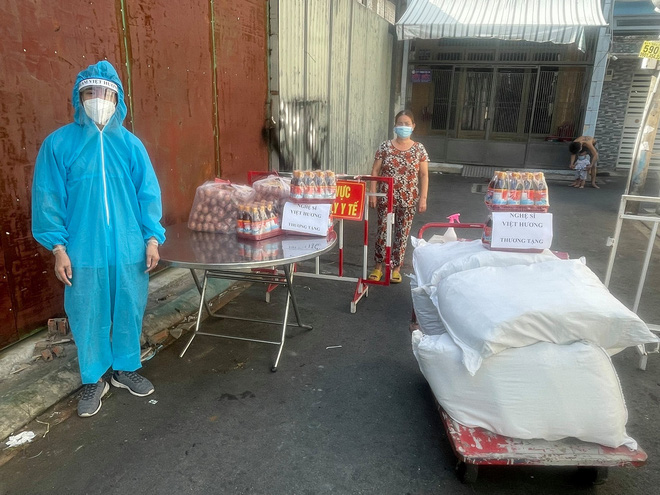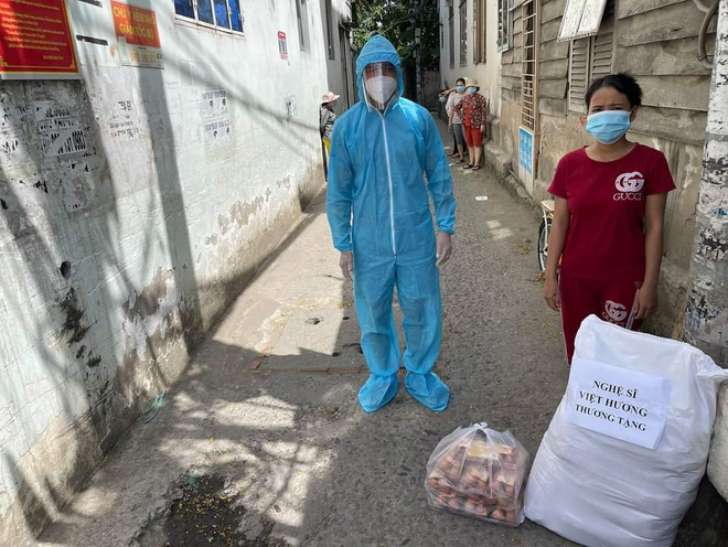 Quà Hương cho bà con không nhiều giá trị nhưng của một đồng mà công một nén. Mỗi người có 5 ký gạo, chục trứng, mớ rau, cái bánh, hộp sữa thôi nhưng mỗi nơi vài chục phần, vài trăm phần như vậy mà rất nhiều nơi. Sài Gòn mình rộng lắm. Ông xã của Hương tự bưng bê hết.