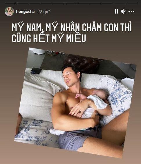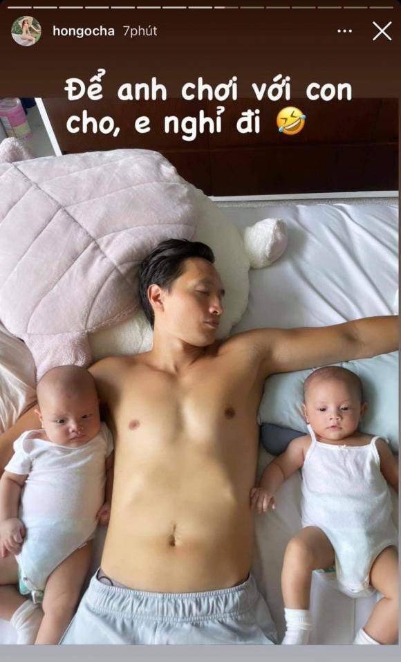 Mới đây, Hồ Ngọc Hà khiến người hâm mộ bật cười khi đăng ảnh "dìm hàng" ông xã điển trai. Nữ ca sĩ cho biết Kim Lý giành việc chăm sóc 2 con để cho vợ nghỉ ngơi. Nhưng chỉ vài phút sau đó, anh đã "gục ngã" trong khi Leon và Lisa vẫn đang nằm chơi bên cạnh. Chứng kiến cảnh này, Hồ Ngọc Hà chỉ biết… "cạn lời".