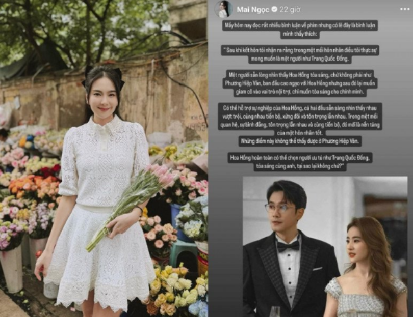 Mới đây, MC Mai Ngọc chia sẻ tấm ảnh của cặp đôi Hoàng Diệc Mai (Lưu Diệc Phi đóng) và tình đầu Trang Quốc Đống (Bành Quán Anh đóng), kèm những trải lòng: "Mấy hôm nay đọc rất nhiều bình luận về phim nhưng có lẽ đây là bình luận mình thấy thích: 'Sau khi kết hôn tôi nhận ra rằng trong một cuộc hôn nhân điều tôi thực sự mong muốn là một người như Trang Quốc Đống.
