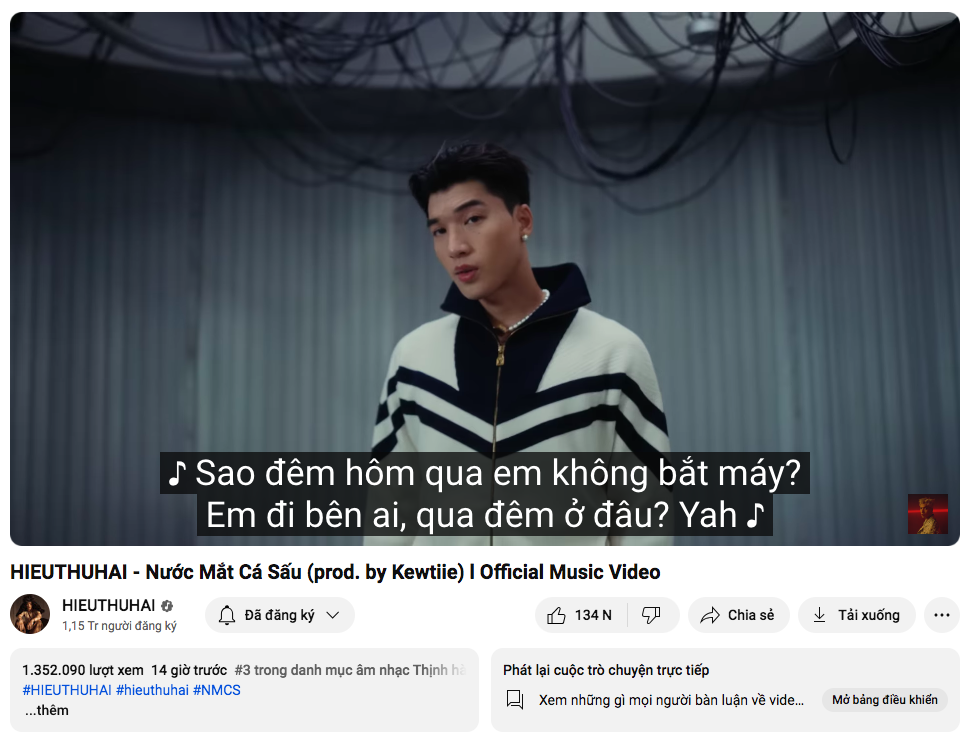 Nhưng, sau khi lên sóng hơn nửa ngày, Nước Mắt Cá Sấu lại chưa được bùng nổ như mong đợi. Tính đến 10h sáng 2/4, MV thu về hơn 1.3 triệu lượt xem, leo thẳng top 3 trending âm nhạc YouTube Việt Nam. Lượt xem tăng nhanh là điều dễ hiểu với độ hot của HIEUTHUHAI và FC lớn mạnh hiện tại. Nhưng so về mức độ thảo luận, HIEUTHUHAI vẫn chưa có một ca khúc xứng tầm. Nước Mắt Cá Sấu thoả mãn người hâm mộ, nhưng rất khó để làm hài lòng tai nghe khán giả đại chúng đang kỳ vọng cao ở HIEUTHUHAI sau show thực tế.