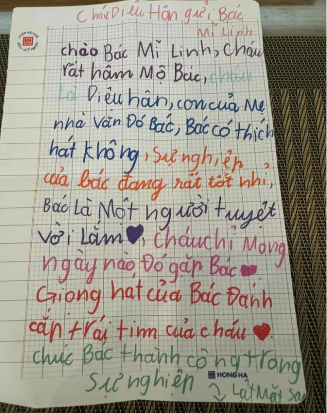 "Chào bác Mỹ Linh, cháu rất hâm mộ bác. Bác là một người tuyệt vời lắm. Cháu chỉ mong ngày nào đó gặp bác." Những lời tâm tình ngây ngô của cô bé càng nổi bật khi được viết bằng nhiều màu mực khác nhau, qua đó càng làm cho bức thư này trở nên nổi bật.