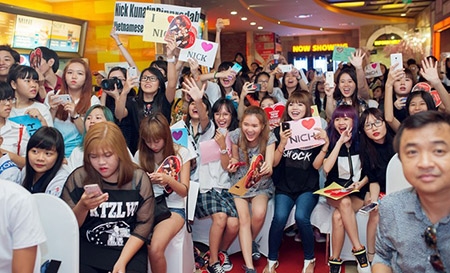 Trước lời đề nghị của người hâm mộ, Nick tự tin thể hiện giọng hát và khả năng vũ đạo với ca khúc trong phim Trai đẹp thời nay. Đông đảo fan đã chạy lên sân khấu để nhảy cùng nam diễn viên và dành tặng cho anh nhiều bó hoa. |