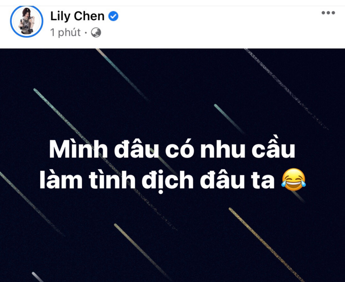 Mới đây, Lily Chen chính thức đăng đàn nói về ồn ào xài chung bồ với ai đó đang xôn xao "cõi mạng" những ngày qua. Theo đó, cô nhấn mạnh" không có nhu cầu làm tình địch" và không muốn dính líu với bất kỳ ai.