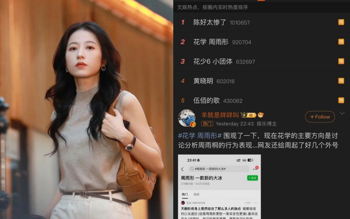 Trong một bài đăng từng lên top 2 hot search Weibo cách đây không lâu, Châu Vũ Đồng bị chê nói năng thiếu tinh tế như Tạ Na, hay gây chuyện như Thư Sướng, khác người như Ninh Tịnh, thích khích bác như Mao A Mẫn. Chẳng những vậy, bài đăng này còn chê mỹ nhân sinh năm 1994 ham thể hiện và tính toán tiền bạc quá chi li.