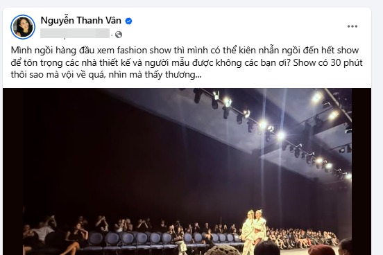 Trên trang cá nhân, Vân Hugo đã đăng tải bức xúc của mình kèm theo hình ảnh bằng chứng: "Mình ngồi hàng đầu xem fashion show thì mình có thể kiên nhẫn ngồi đến hết show để tôn trọng các nhà thiết kế và người mẫu được không các bạn ơi? Show có 30 phút thôi sao mà vội về quá, nhìn thấy thương...".