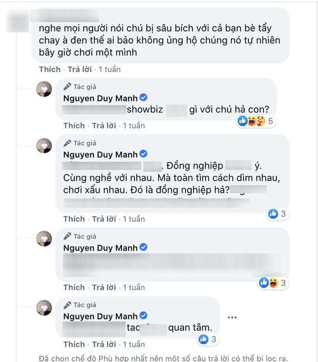 Cho đến mới đây, trong một bài viết của Duy Mạnh, đã có khán giả thẳng thắn đặt câu hỏi về việc anh bị cả showbiz tẩy chay. Ngay lập tức, nam ca sĩ liền có pha đáp trả cực gắt: "Đồng nghiệp *** ***, cùng nghề mà toàn tìm cách dìm nhau, chơi xấu nhau. Đó là đồng nghiệp hả?". Một lần nữa, chia sẻ của Duy Mạnh tiếp tục hé lộ thêm góc khuất của showbiz. Dù chưa biết thực hư thế nào nhưng bình luận này vẫn khiến netizen không khỏi xôn xao.