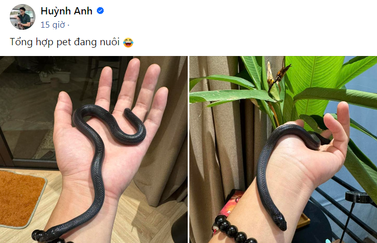 Bộ sưu tập thú cưng của diễn viên Huỳnh Anh khiến nhiều người trầm trồ khi có nhiều loài vật độc đáo. Chia sẻ trên trang cá nhân, nam diễn viên Biệt Dược Đen đã tổng hợp tất cả những động vật mà anh đang nuôi trong nhà.