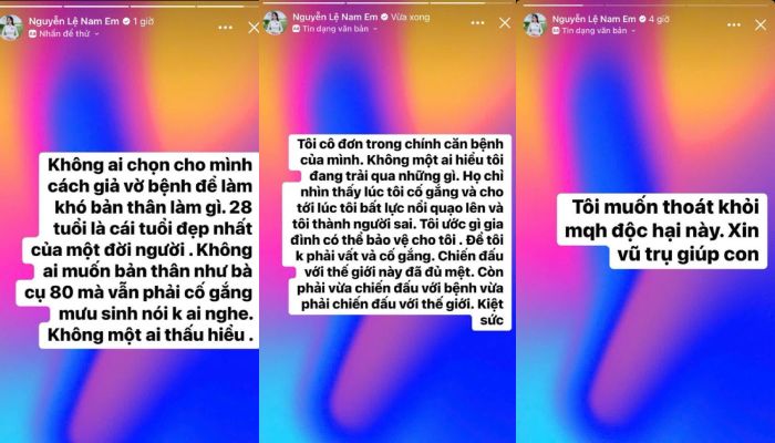 Tôi ước gì gì gia đình có thể bảo vệ cho tôi. Để tôi không phải vất cả cố gắng. Chiến đấu với thế giới này đã đủ mệt. Còn phải vừa chiến đấu với bệnh vừa phải chiến đấu với thế giới. Kiệt sức", Nam Em vừa chia sẻ.