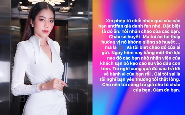 Nam Em viết: "Xin phép từ chối nhận quà của các bạn antifan giả danh fan nhé. Đặc biệt là đồ ăn. Tôi nhận cháo của các bạn. Cháo sò huyết mà tôi ăn tôi thấy hương vị nó không giống sò huyết... mà là ***. Và tôi biết cháo đó của ai gửi.
