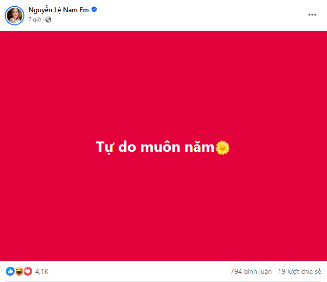 Ngoài ra, sau đoạn clip gây tranh cãi, Nam Em cũng đăng dòng status "Tự do muôn năm" trên trang cá nhân. Nhiều người suy đoán có thể cô và doanh nhân Hữu Cường đã chia tay.