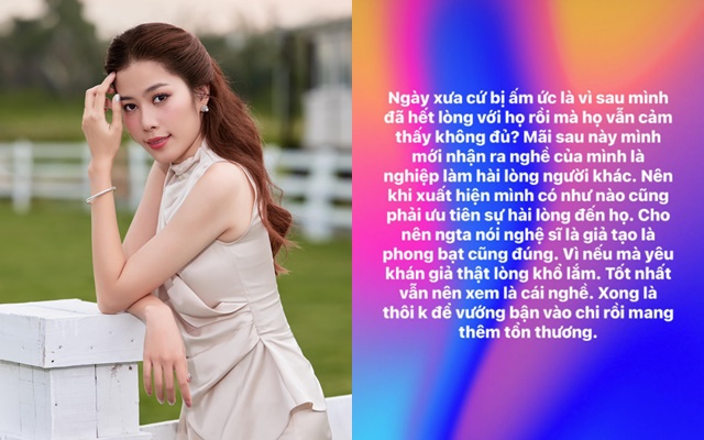 "Ngày xưa cứ bị ấm ức là vì sao mình đã hết lòng với họ, mà họ vẫn cảm thấy không đủ? Mãi sau này mình mới nhận ra nghề của mình là nghiệp làm hài lòng người khác. Nên khi xuất hiện mình có như nào cũng phải ưu tiên sự hài lòng đến họ. Cho nên người ta nói nghệ sĩ là giả tạo, là phông bạt cũng đúng. Vì nếu mà yêu khán giả thật lòng khổ lắm. Tốt nhất vẫn nên xem là cái nghề. Xong là thôi không để vướng bận vào chi rồi mang thêm tổn thương", cô chia sẻ.