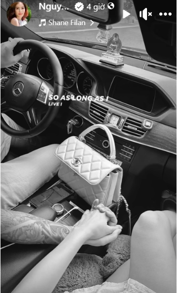 Nam Em tiếp tục chia sẻ loạt ảnh hẹn hò cùng bạn trai giấu mặt trên trang cá nhân. Người đẹp chia sẻ khoảnh khắc nắm tay đầy tình tứ trong ô tô, cùng với đó khéo léo khoe chiếc nhẫn kim cương cỡ lớn trên ngón áp út.