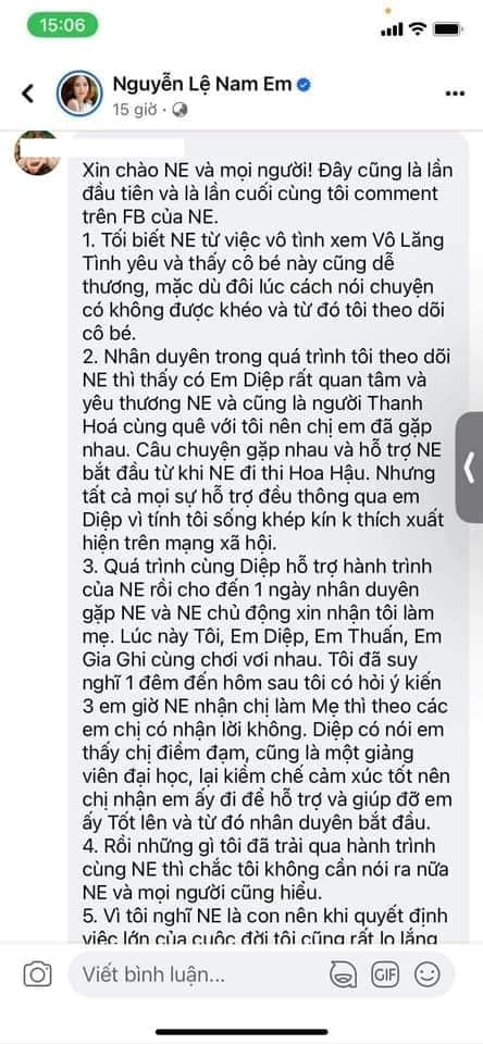 Nhân vật trong đoạn chat cũng nhanh chóng lên tiếng phản hồi bên dưới một bài đăng của Nam Em. Người này cho biết mình là một giảng viên đại học, chủ doanh nghiệp gần 50 tuổi đã theo dõi và cảm mến Nam Em sau khi xem chương trình Vô lăng tình yêu . Sau khi có cơ hội gặp trực tiếp nhờ sự giới thiệu của bạn bè, chính Nam Em là người ngỏ ý muốn được nhận người phụ nữ này làm mẹ. Người này còn tiết lộ đã từng cho Nam Em tiền cũng như để cô vay mượn, còn khuyên bảo "con gái nuôi" nên suy nghĩ lại về quyết định kết hôn với đối tượng sắp cưới. Sau cùng, tài khoản này mong mọi ồn ào tiền nong với Nam Em được khép lại.