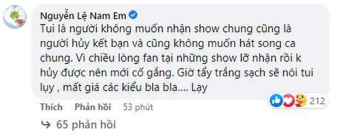 Mới đây nhất, trên trang cá nhân, Nam Em đã thẳng thắn thừa nhận bản thân chủ động hủy kết bạn với Bạch Công Khanh. Cụ thể người đẹp bức xúc cho biết: "Tui là người không muốn nhận show chung cũng là người hủy kết bạn và cũng không muốn hát song ca chung. Vì chiều lòng fan tại những show lỡ nhận rồi không hủy được nên mới cố gắng. Giờ tẩy trắng sạch sẽ nói tui lụy, mất giá các kiểu bla bla... Lạy".