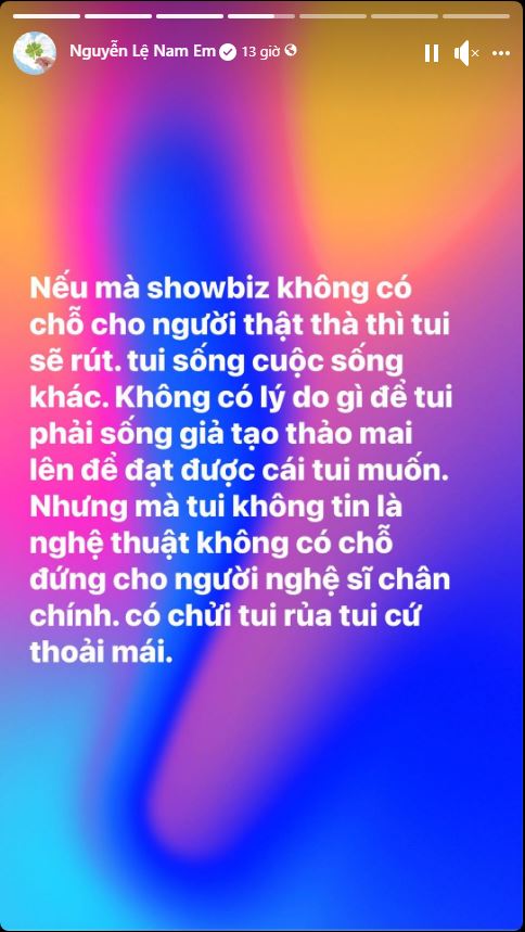 Ở một diễn biến khác, trên phần story Facebook, Nam Em tỏ rõ sự bức xúc và tuyên bố sẵn sàng rút khỏi showbiz để sống một cuộc sống khác: "Nếu mà showbiz không có chỗ cho người thật thà thì tui sẽ rút. Tôi sống cuộc sống khác, không có lý do gì để tôi phải sống thảo mai lên để đạt được cái tôi muốn. Nhưng mà tôi không tin là nghệ thuật không có chỗ đứng cho người nghệ sĩ chân chính. Có chửi tôi rủa tôi cứ thoải mái".