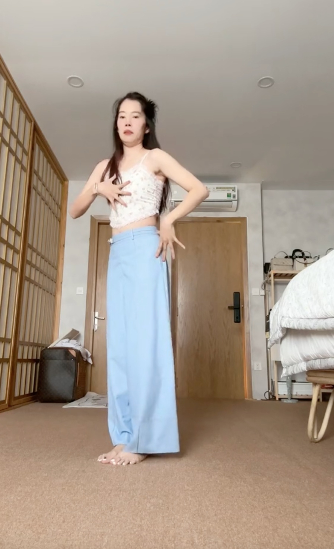 Vì không nhớ động tác nên cô nàng vừa nhảy vừa thể hiện gương mặt khá buồn cười. Dẫu vậy, Nam Em cũng nhiệt tình lắc hông, lắc eo, đưa tay vuốt lên người rồi tạo dáng gợi cảm. Nam Em hiện tại khá gầy, khi xoay người về phía ống kính, người đẹp 9x cũng để lộ những vết bầm trên cánh tay. Một số khán giả cho rằng đây là vết bầm từ việc giác hơi.