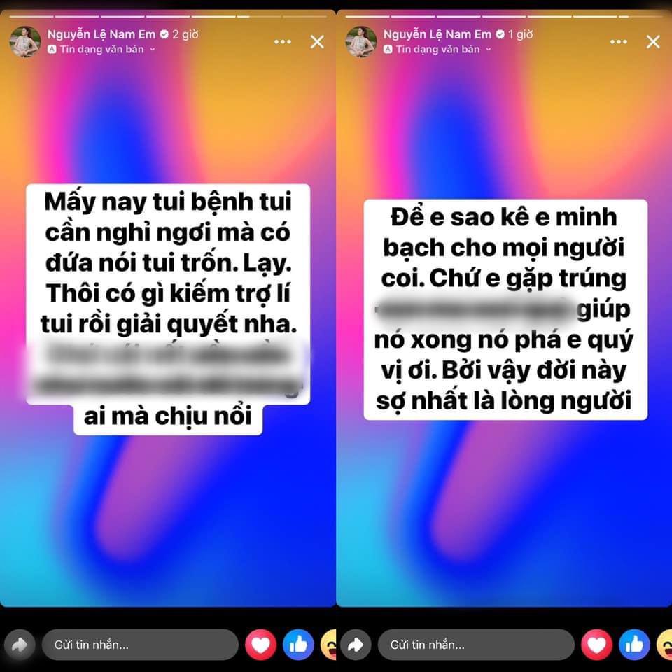 Giữa lúc cái tên bị réo gọi trên mạng xã hội, Nam Em đã có động thái trên trang cá nhân. Theo đó, cô cho biết bản thân bị ốm chứ không trốn tránh trách nhiệm. "Mấy nay tôi bệnh cần nghỉ ngơi mà có đứa nói trốn. Lạy. Thôi có gì kiếm trợ lý tôi rồi giải quyết nhé", cô viết. Thậm chí, Nam Em còn cho biết sẵn sàng sao kê rõ ràng: "Để tôi sao kê minh bạch cho mọi người coi. Giúp nó xong nó phá em quý vị ơi. Bởi vậy đời này sợ nhất là lòng người".