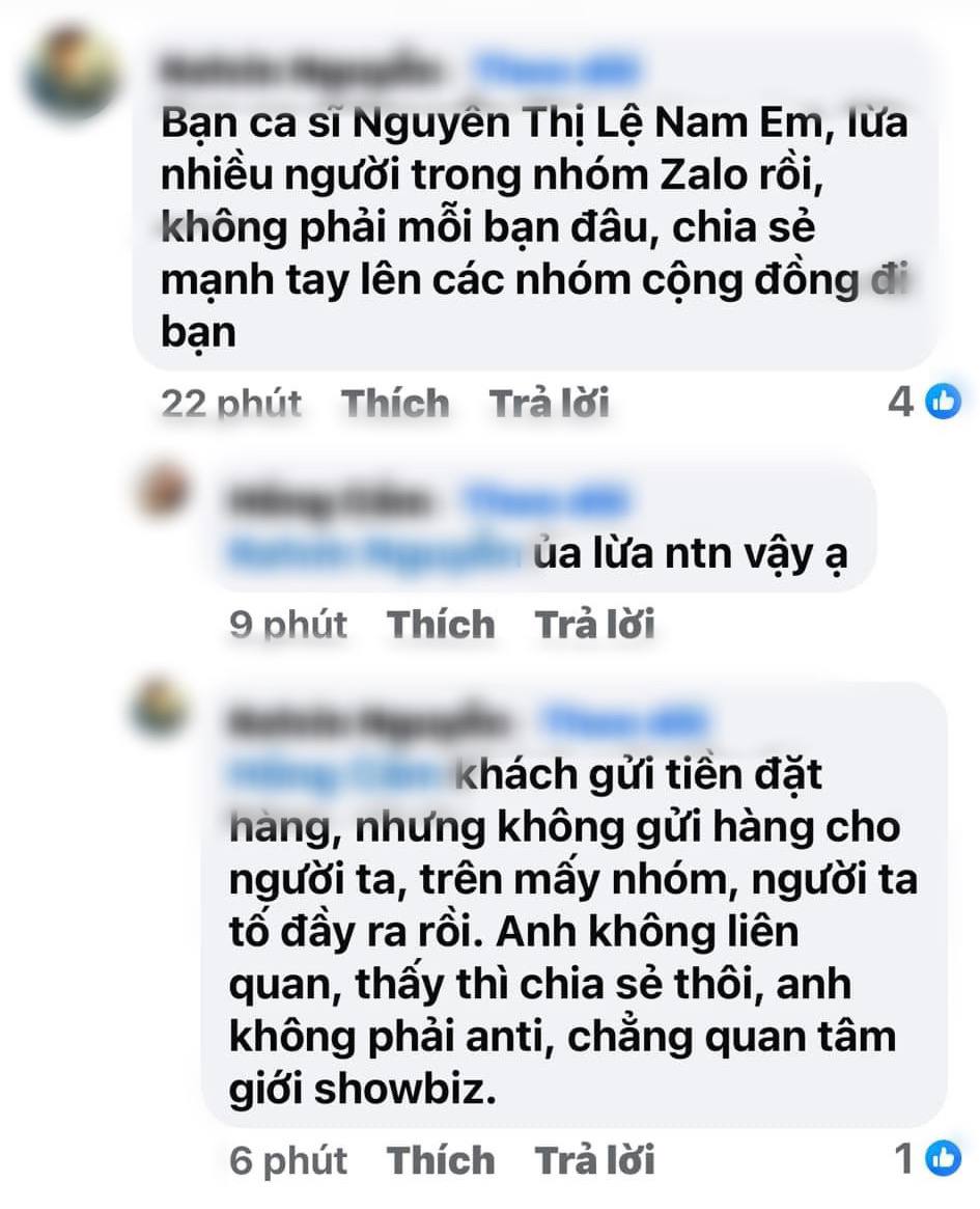 Dưới bài viết này, một netizen còn cho rằng mình bị Nam Em lừa đảo không gửi hàng dù đã chuyển khoản đặt hàng. "Bạn ca sĩ Nam Em lừa nhiều người trong nhóm Zalo rồi, không phải mỗi bạn đâu, chia sẻ mạnh tay lên các nhóm cộng đồng đi bạn. Khách gửi tiền đặt hàng nhưng không gửi hàng cho người ta. Trên mấy nhóm người ta tố đầy ra rồi", người này viết.