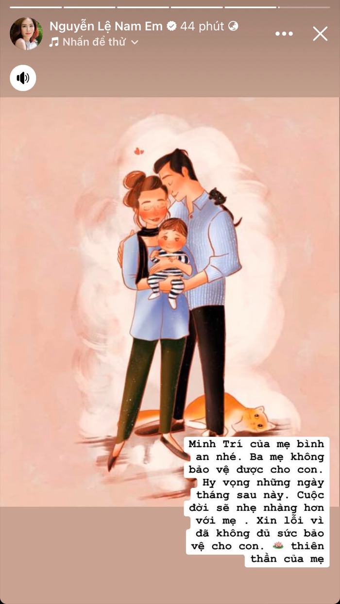 Trước đó, vào sáng 8/12, Nam Em bất ngờ đăng tải bức tranh vẽ gia đình kèm theo nội dung như sau: "Minh Trí của mẹ bình an nhé. Ba mẹ không bảo vệ được cho con. Hy vọng những ngày tháng sau này, cuộc đời sẽ nhẹ nhàng hơn với mẹ. Xin lỗi vì đã không đủ sức bảo vệ cho con. Thiên thần của mẹ".