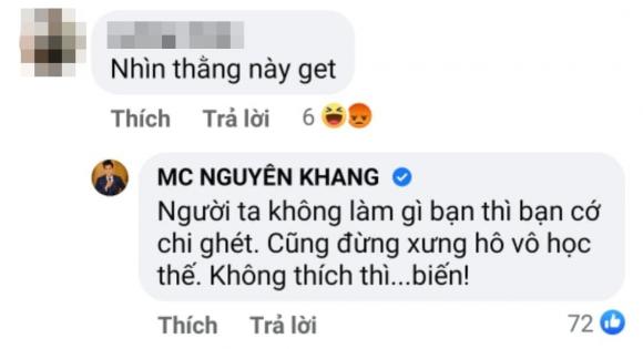 Một người đã có những lời lẽ khá nhạy cảm: "Nhìn thằng này ghét". Ngay lập tức, Nguyên Khang thẳng thắn đáp trả: "Người ta không làm gì bạn thì bạn cớ gì ghét. Cũng đừng xưng hô vô học thế. Không thích thì biến". Được biết, MC Nguyên Khang từng có một thời gian bị khán giả chỉ trích vì dẫn chương trình vô duyên, hỏi sỗ sàng người chơi, hay sự cố đọc nhầm quán quân Giọng hát Việt nhí 2019. Cũng vì vậy mà anh "thu về" kha khá anti.