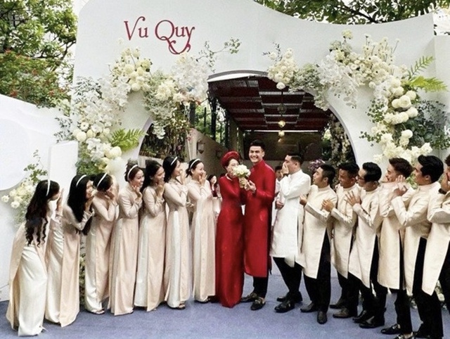 Sau đó, mạng xã hội tiếp tục xuất hiện hình ảnh hôn lễ của Vĩnh Thuỵ và bà xã tại Đà Lạt vào ngày 2/12. Hôn lễ được diễn ra riêng tư, kín đáo trước sự chứng kiến gia đình, bạn bè thân thiết với cặp đôi. Không gian đám cưới siêu mẫu Vĩnh Thuỵ trang trí ngập tràn hoa tươi, tông màu chủ đạo trắng kem. Chú rể xuất hiện bảnh bao, lịch lãm trong áo sơ mi trắng, quần âu. Cô dâu nền nã, xinh đẹp diện váy cưới màu trắng tinh khôi, khoe vai trần quyến rũ.