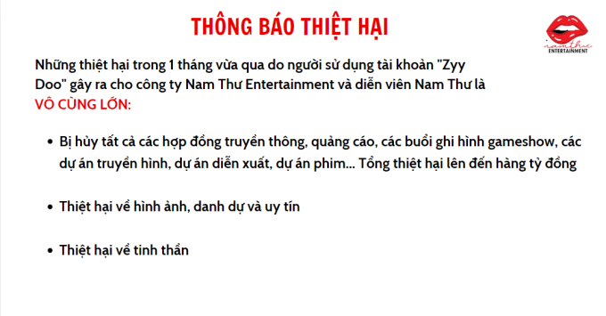 Phía công ty Nam Thư giải thích lý do im lặng suốt 1 tháng mới lên tiếng: "Thời gian qua, phía Nam Thư chọn im lặng vì muốn thu thập đủ thông tin, bằng chứng để lập vi bằng phục vụ cho công tác điều tra từ cơ quan chức năng. Đến hiện tại, Nam Thư Entertainment quyết định lên tiếng để làm rõ vụ việc, đồng thời muốn bảo vệ danh dự, hình ảnh của mình cũng như trấn an người hâm mộ đã yêu thương, đồng hành trong quãng thời gian qua. Nam Thư Entertainment khẳng định, Nam Thư không phải là 'người thứ ba', xen vào mối quan hệ tình cảm của tài khoản Zyy Doo. Phía Nam Thư Entertainment đã đề nghị công ty luật hỗ trợ pháp lý, tiến hành các thủ tục theo quy định của pháp luật để tố cáo những hành vi vi phạm của chủ tài khoản Zyy Doo cũng như các cá nhân, đơn vị khác có liên quan, nhằm bảo vệ quyền lợi cho nghệ sĩ trực thuộc công ty".