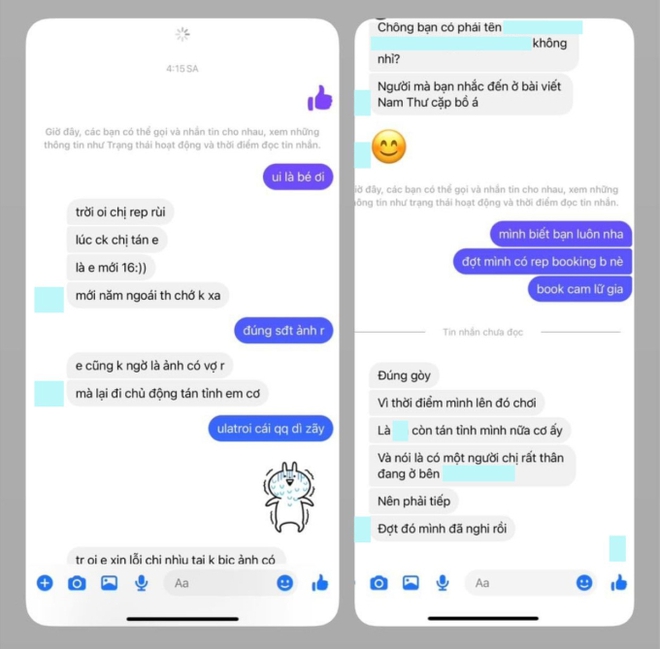 Cụ thể, trên trang cá nhân, Z.D đăng tải ảnh chụp màn hình tin nhắn trò chuyện với 2 cô gái. Theo nội dung tin nhắn với một trong hai cô gái, sau khi xác nhận thông tin cá nhân như tên thật và tài khoản Instagram của chồng Z.D thì cô gái này cho biết L. từng tán tỉnh trong lúc cô đến thuê homestay. Z.D nhận ra cô gái nhắn tin với mình vì thời điểm cô gái này thuê homestay thì Z.D chính là người trả lời tin nhắn đặt phòng. Ở một ảnh chụp màn hình tin nhắn khác, có một cô gái cũng liên hệ với Z.D để thừa nhận từng bị L. tán tỉnh khi mới 16 tuổi.