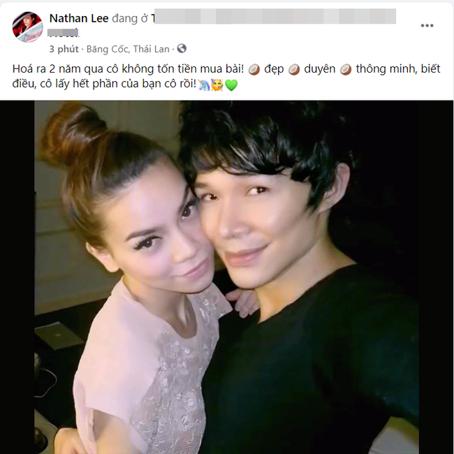 Đáng chú ý, "ông hoàng livestream" của showbiz Việt còn dành lời khen ngợi cho Hồ Ngọc Hà: "Vừa đẹp, vừa duyên, vừa thông minh, biết điều". Tuy nhiên, Nathan Lee cũng không quên "đá xéo" người bạn của Hồ Ngọc Hà là nhạc sĩ Nguyễn Hồng Thuận: "Cô lấy hết phần của bạn cô rồi".