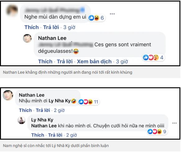 Đặc biệt, một người bạn còn như ngầm hiểu ý Nathan Lee, cùng nhắc về một nhân vật cố tình dàn dựng "lộng giả thành chân". Người này cho biết: "Nghe mùi dàn dựng quá em ơi", khiến Nathan Lee đồng tình, viết bằng tiếng Pháp: "Ces gens sont vraiment dégueulasses!" (Tạm dịch: Những người này thực sự rất kinh khủng).