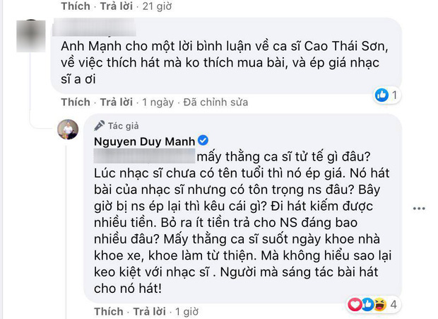 Giữa lúc này, một netizen đã đem câu chuyện của Cao Thái Sơn để hỏi ý kiến của Duy Mạnh. Giọng ca Kiếp đỏ đen đã đưa ra câu trả lời gây tranh cãi: "Mấy thằng ca sĩ tử tế gì đâu. Lúc nhạc sĩ chưa có tên tuổi thì nó ép giá. Nó hát bài của nhạc sĩ nhưng có tôn trọng nhạc sĩ đâu. Bây giờ bị nói ép lại thì kêu cái gì? Đi hát kiếm được nhiều tiền, bỏ ra ít tiền trả cho nhạc sĩ đáng bao nhiêu đâu? Mấy thằng ca sĩ suốt ngày khoe nhà, khoe xe, khoe làm từ thiện mà không hiểu sao lại keo kiệt với nhạc sĩ, người sáng tác bài hát cho nó hát".