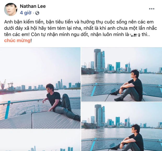 Đáng chú ý, ít giờ sau status trên, Nathan tiếp tục có động thái cực gắt, lần này không còn úp mở mà nhắc thẳng tên "nữ hoàng nội y". Nam ca sĩ kể lại quá khứ từng giúp đỡ, bảo vệ và tình cờ giúp cuộc đời của Ngọc Trinh bước sang trang mới nhưng nay lại bị "cắn ngược". Dưới phần bình luận, khi được một cư dân mạng hỏi thăm, Nathan Lee cũng không giấu được sự bức xúc: "Tự nhiên bị dính vào mấy thể loại không cùng đẳng cấp".