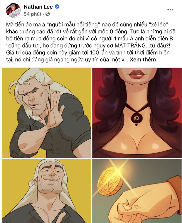 "Mã tiền ảo mà 'người mẫu nổi tiếng' nào đó cùng nhiều 'xê lép' khác quảng cáo đã rớt về rất gần với mốc 0 đồng. Tức là những ai đã bỏ tiền ra mua đồng coin đó chỉ vì cô người 1 mẫu A, anh diễn viên B 'cũng đầu tư', họ đang đứng trước nguy cơ mất trắng từ đâu? Giá trị của đồng coin này giảm tới 100 lần và tính tới thời điểm hiện tại, nó chỉ đáng giá ngang ngửa uy tín của một vài 'ngôi thao' (Ngôi sao - PV). Tức là nửa xu chưa thương lượng.