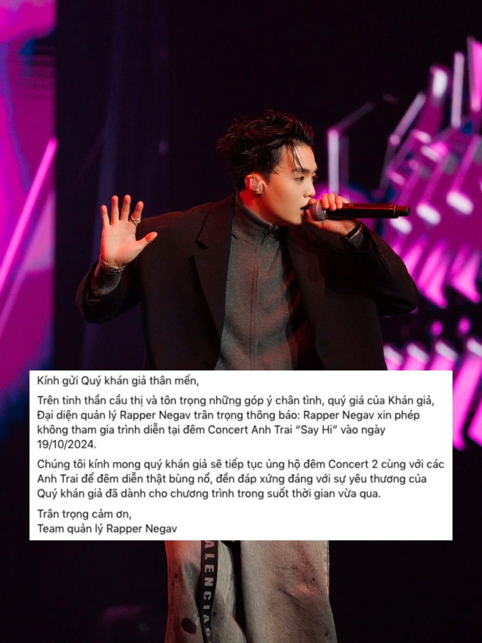 Cụ thể, đại diện Negav thông báo:"Kính gửi Quý khán giả thân mến. Trên tinh thần cầu thị và tôn trọng những góp ý chân tình, quý giá của Khán giả, Đại diện quản lý Rapper Negav trân trọng thông báo: Rapper Negav xin phép không tham gia trình diễn tại đêm Concert Anh trai say hi vào ngày 19/10/2024. Chúng tôi kính mong quý khán giả sẽ tiếp tục ủng hộ đêm Concert 2 cùng với các Anh Trai để đêm diễn thật bùng nổ, đền đáp xứng đáng với sự yêu thương của Quý khán giả đã dành cho chương trình trong suốt thời gian vừa qua. Trân trọng cảm ơn".
