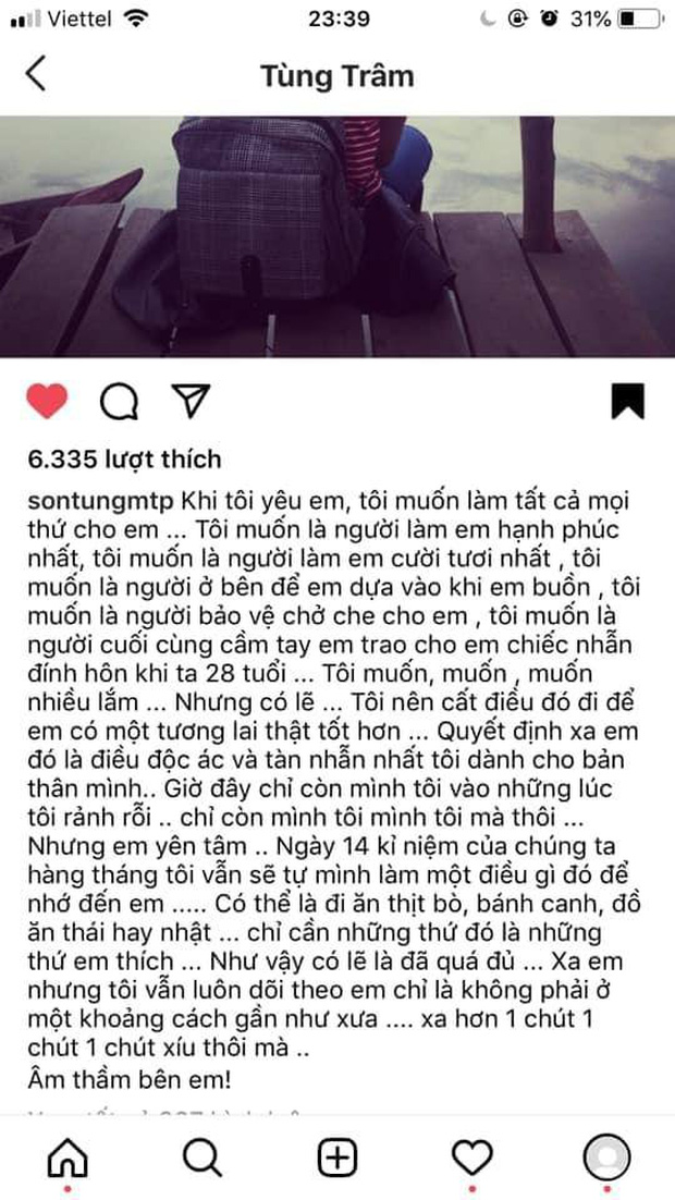 Nhưng em yên tâm... Ngày 14 kỉ niệm chúng ta hàng tháng, tôi sẽ tự mình làm một điều gì đó để nhớ đến em. Có thể đi ăn thịt bò, bánh canh, đồ ăn Thái hay Nhật... chỉ cần những thứ đó là thứ em thích. Như vậy có lẽ là quá đủ. Xa em nhưng tôi vẫn luôn theo dõi em chỉ là không phải ở một khoảng cách gần như xưa. Xa hơn 1 chút, 1 chút, 1 chút xíu thôi mà... Âm thầm bên em", Sơn Tùng viết.