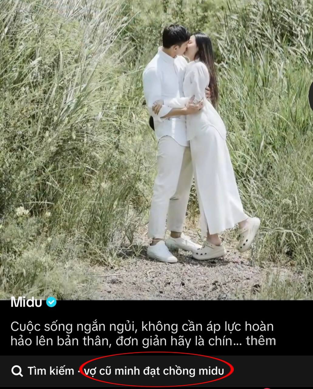 Đáng chú ý, ở đoạn video này của Midu còn xuất hiện tìm kiếm gây sốc về thiếu gia Minh Đạt. Cụ thể, phần tìm kiếm xuất hiện dòng chữ: "Vợ cũ Minh Đạt chồng Midu". Tuy nhiên, vào tháng 6/2024, nữ diễn viên sinh năm 1989 từng khẳng định nửa kia kém cô 1 tuổi, chưa từng lập gia đình.