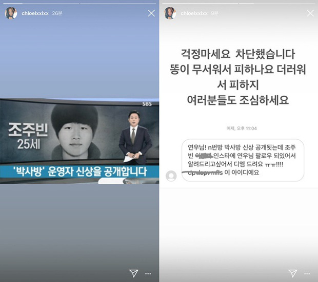 Sau khi tìm thấy tên Yeonwoo trong danh sách theo dõi của Cho, một người đã ngay lập tức nhắn tin để thông báo cho cô về vụ việc. Rất nhanh chóng, nữ idol 24 tuổi đã có động thái phản hồi bằng cách chia sẻ tin nhắn của người cảnh báo lên story: "Yeonwoo! Tên Baksa trong chatroom Telegram đã được tiết lộ chính là Cho Joo Bin. Tài khoản của hắn ta đang theo dõi tài khoản của chị. Em nhắn cho chị để nói cho chị biết đó. @dpvlspvmfls chính là địa chỉ tài khoản của hắn".