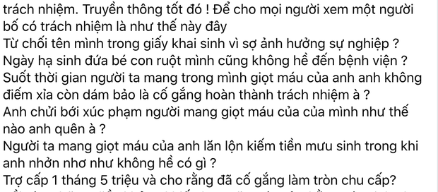 Sau khi scandal nổ ra, T.V cho biết trong suốt quá trình yêu nhau cô luôn chịu thiệt thòi, lùi về phía sau vì sợ bạn trai bị ảnh hưởng sự nghiệp. Thế nên khi biết được sự thật, T.V vô cùng đau lòng. Cô lại càng thất vọng khi bạn trai mình còn vô trách nhiệm với chính con đẻ.