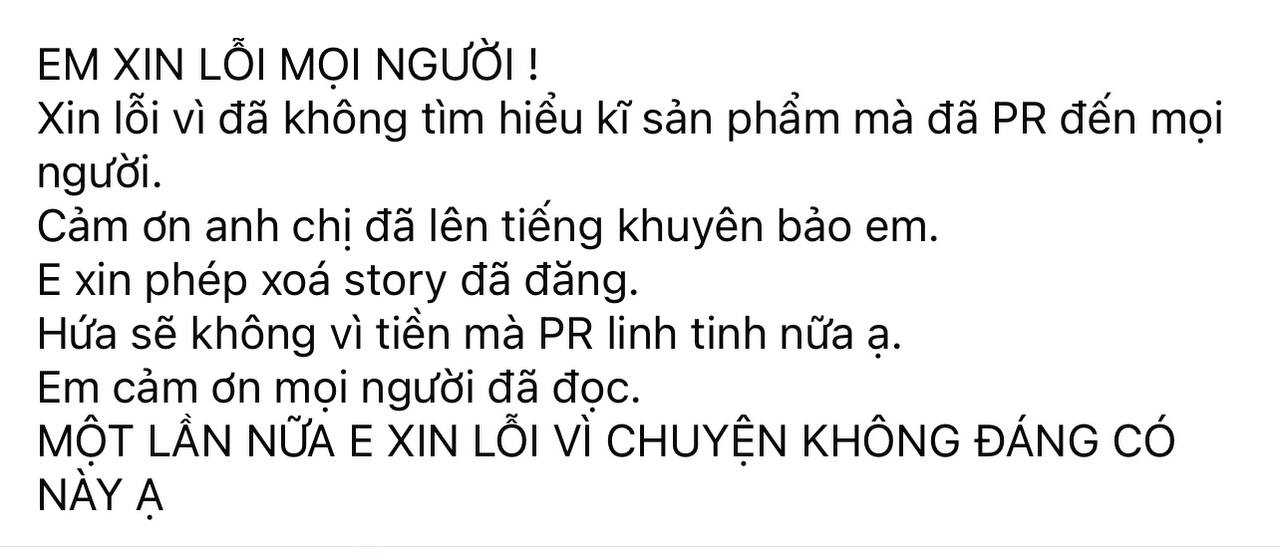 "Em xin lỗi mọi người. Xin lỗi vì đã không tìm hiểu kĩ sản phẩm mà đã PR đến mọi người. Cảm ơn anh chị đã lên tiếng khuyên bảo em. Em xin phép xoá story đã đăng. Hứa sẽ không vì tiền mà PR linh tinh nữa ạ. Em cảm ơn mọi người đã đọc", cô chia sẻ.