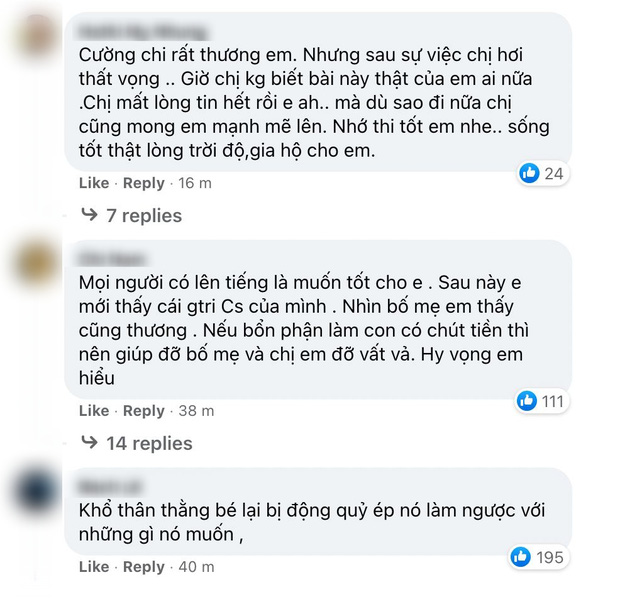 - Cường chị rất thương em, nhưng sau sự việc chị hơi thất vọng. Dù sao đi nữa chị cũng mong em mạnh mẽ lên. Thi tốt nhé em.