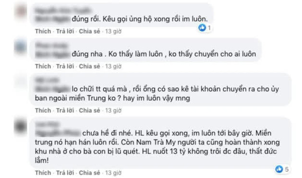21/05/2021 02:22Netizen thắc mắc: Sau 6 tháng kêu gọi hơn 13 tỷ đồng hỗ trợ lũ lụt miền Trung, NS Hoài Linh vẫn chưa thông báo đã chuyển tới người dân?