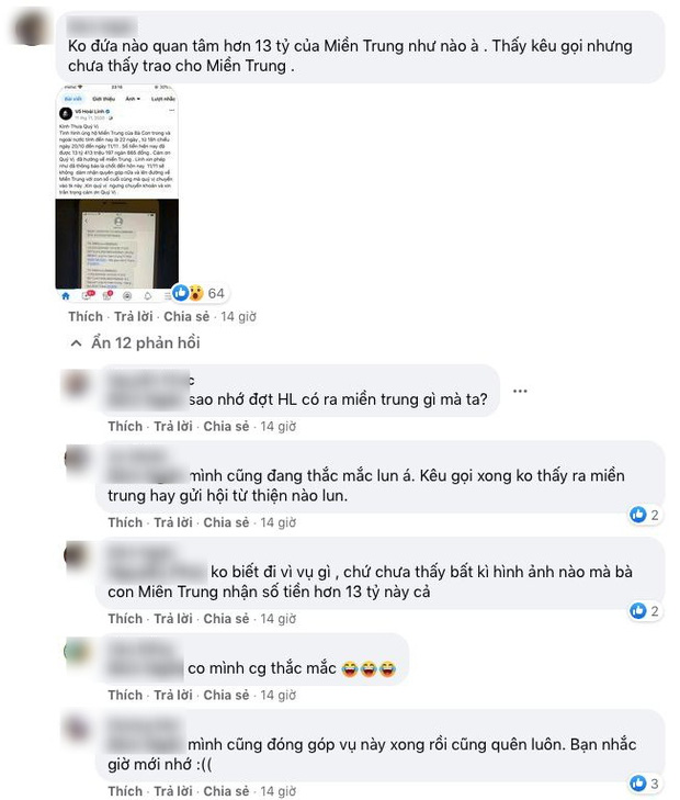 Tuy nhiên, kể từ đó đến nay đã 6 tháng, dù đã dùng mạng xã hội trở lại, đăng tải nhiều clip, bài viết về các hoạt động trong cuộc sống nhưng NS Hoài Linh chưa từng có động thái thông báo về việc đã chuyển số tiền này tới bà con miền Trung hay chia sẻ hình ảnh lên đường tới miền Trung để trao cho người dân như đã nói. Điều này đang làm khán giả vô cùng thắc mắc và bàn tán sôi nổi tại bất kì bài đăng nào về NS Hoài Linh trên MXH.