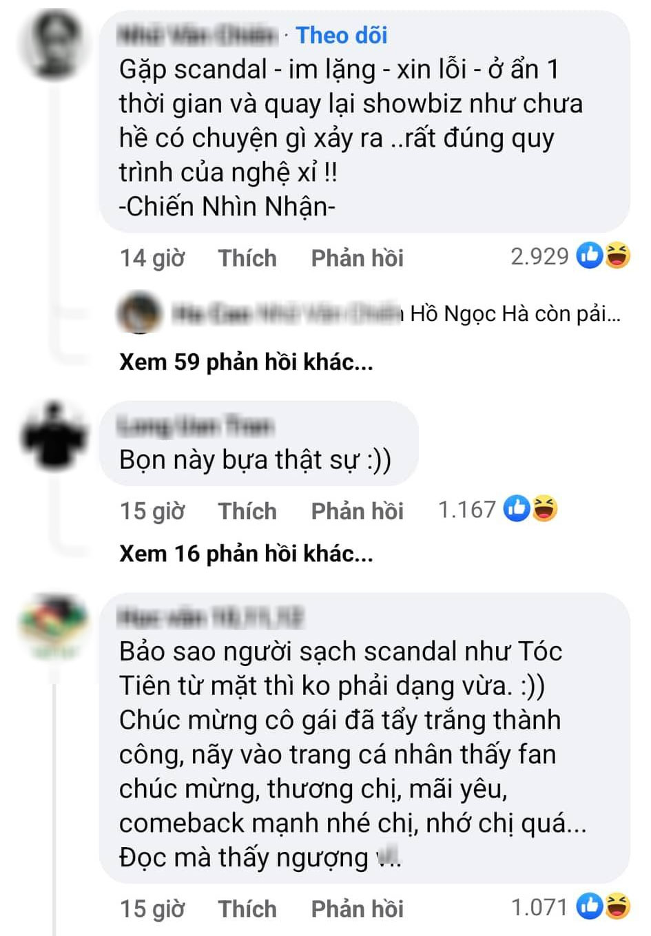 - "Vướng ồn ào một thời gian là quay trở lại showbiz, tính ra khán giả Việt cũng không quá khắt khe".
