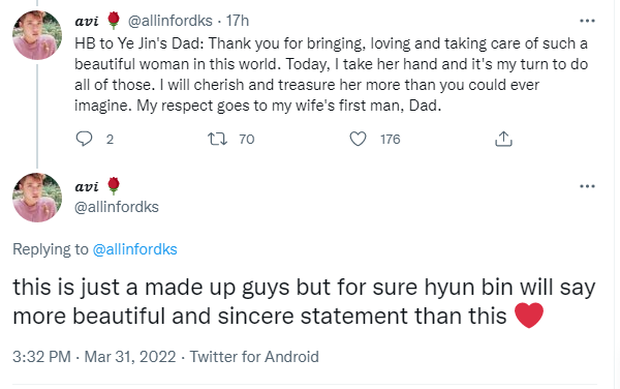 Thế nhưng mới đây, các fan đã phải ngã ngửa hàng loạt vì sự thật về những câu nói cảm động này đã được làm rõ. Theo đó, đây chỉ là 1 câu chuyện không có thật được fan yêu mến BinJin… tự bịa ra và đăng tải trên Twitter. 1 fan quá khích tự dựng lên những lời nhắn nhủ này giữa lúc cả châu Á hóng cao độ siêu đám cưới và đông đảo fan quá khích đến mức không đọc kỹ dòng chú thích của “tác giả” rằng đây chỉ là chuyện tưởng tượng, dẫn đến việc câu chuyện bị lan truyền khắp nơi.