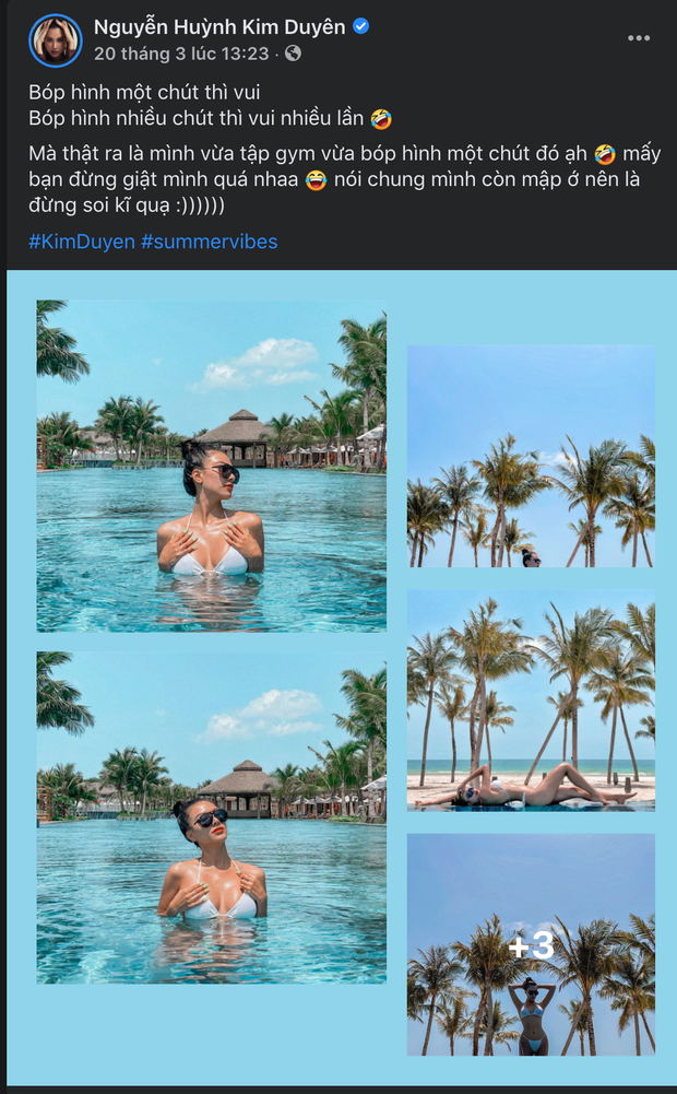 Cụ thể, Kim Duyên đã rất hài hước khi thừa nhận rằng tất cả những ảnh mình đăng tải đều phải bóp ảnh một chút. Cô còn cho biết bóp hình càng nhiều càng vui, thậm chí vừa tập gym cũng phải vừa chỉnh ảnh. Nàng á hậu cũng chia sẻ mọi người cũng đừng nên soi kỹ quá nhé vì lỡ càng soi thì càng thấy đẹp đó!