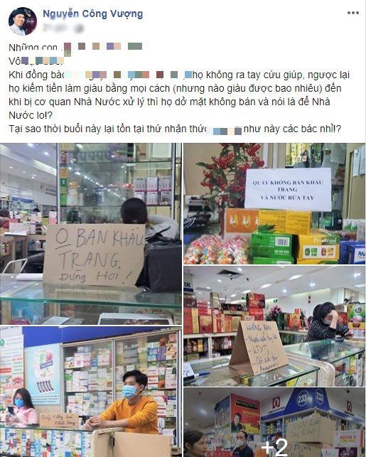 Ngay sau đó, nghệ sĩ Vượng Râu chia sẻ một loạt hình ảnh hiệu thuốc đề biển "không bán khẩu trang, miễn hỏi" đồng thời gay gắt bày tỏ thái độ trên trang cá nhân về những trường hợp này.