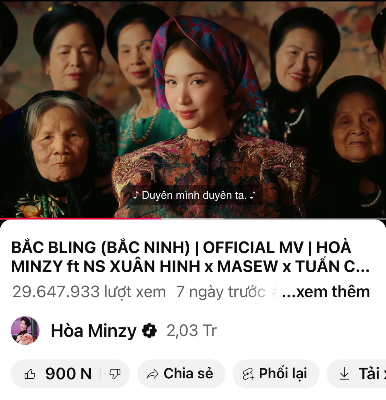 Nói đến MV Vpop hot nhất hiện tại, chắc chắn không còn cái tên nào qua khỏi Bắc Bling. Hoà Minzy liên tục lập kỷ lục lượt xem, chỉ sau 7 ngày thu về gần 30 triệu lượt xem, trụ vững #1 thịnh hành YouTube Việt Nam và leo thẳng top #2 xu hướng âm nhạc toàn cầu, chỉ sau MV Like JENNIE - Jennie (BLACKPINK). Với Bắc Bling, Hoà Minzy tôn vinh trọn vẹn giá trị văn hoá, vẻ đẹp của quê hương Bắc Ninh thông qua ngôn ngữ nghệ thuật - âm nhạc và hình ảnh. Cú bắt tay giữa Hòa Minzy, Xuân Hinh, Tuấn Cry, producer Masew và đạo diễn Nhu Đặng tạo nên cơn lốc thực sự.