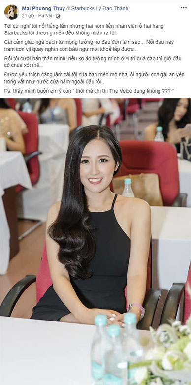 Cứ ngỡ rằng người dân Việt Nam chắc hẳn ai cũng biết mình nhưng Mai Phương Thúy đã bị hai nhân viên ở quán cà phê cho một vố "đau đớn", khiến cô rơi khỏi mộng tưởng vì không nhận ra cô là ai. Thậm chí, khi thấy Mai Phương Thúy có vẻ buồn, hai nhân viên đó còn mạnh dạn an ủi cô bằng cách hỏi rằng có phải cô thi The Voice không. Có lẽ đã quá quen với cuộc sống đi đâu cũng được mọi người chú ý nên trải nghiệm lần này đã khiến Mai Phương Thúy hụt hẫng không ít.