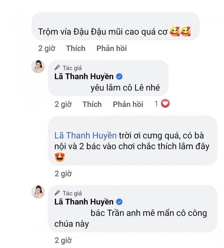 Tuy nhiên, qua màn đối đáp của Lã Thanh Huyền với người thân, bạn bè thì cô bé này là cháu ruột của 2 vợ chồng, tên của bé là Đậu Đậu. Người đẹp chia sẻ thêm ông xã rất yêu thích nhóc tì: "Bác Trần Anh mê mẩn cô công chúa này".