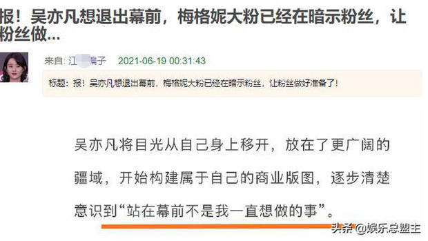 Trong một diễn biến mới nhất, 1 blogger thạo tin Cbiz bất ngờ đứng ra chia sẻ thông tin Ngô Diệc Phàm sẽ rời khỏi làng giải trí. Tuy nhiên, nam ca sĩ sinh năm 1990 này sẽ không rời bỏ Cbiz hoàn toàn mà sẽ làm công việc lo toan hậu trường. Vì những lùm xùm gần đây mà giới giải trí liệt Ngô Diệc Phàm vào hàng nghệ sĩ rủi ro cao, rất có thể trở thành ngôi sao chất lượng kém của Cbiz. Sự nghiệp của nam ca sĩ rất có thể bị khép lại nhanh chóng.