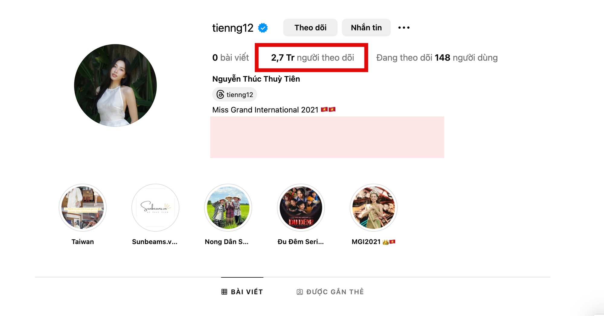 Theo ghi nhận vào chiều ngày 28/5, tài khoản Instagram của Hoa hậu Thuỳ Tiên chỉ còn tầm 2,78 triệu người theo dõi. Trước đó, vào thời điểm cô vừa đóng trang cá nhân là khoản 2,85 - 2,83 triệu lượt. Như vậy, chỉ trong vòng hơn 1 tháng, hoa hậu Thuỳ Tiên đã mất hơn 100 nghìn người theo dõi.